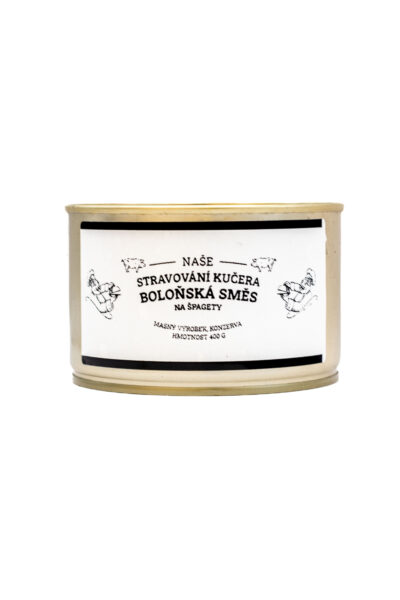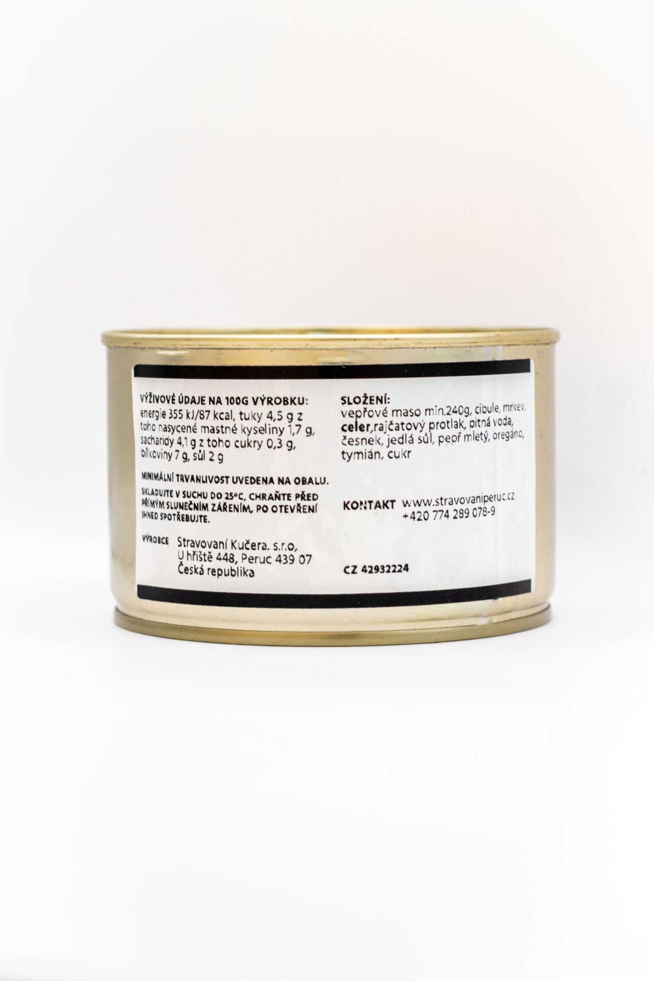 Složení – vepřové maso min.240g, mrkev, celer, protlak, pitná voda, cibule, česnek, pepř, oregáno, tymián, sůl, cukr