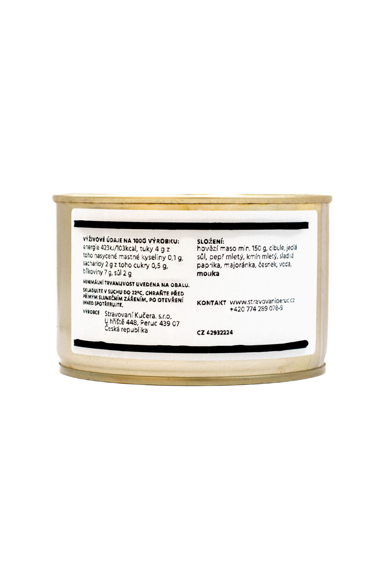 Složení: hovězí maso, sůl, pepř, cibule, paprika sladká, kmín, majoránka, česnek, voda, mouka (obsahuje lepek), hořčice, voda