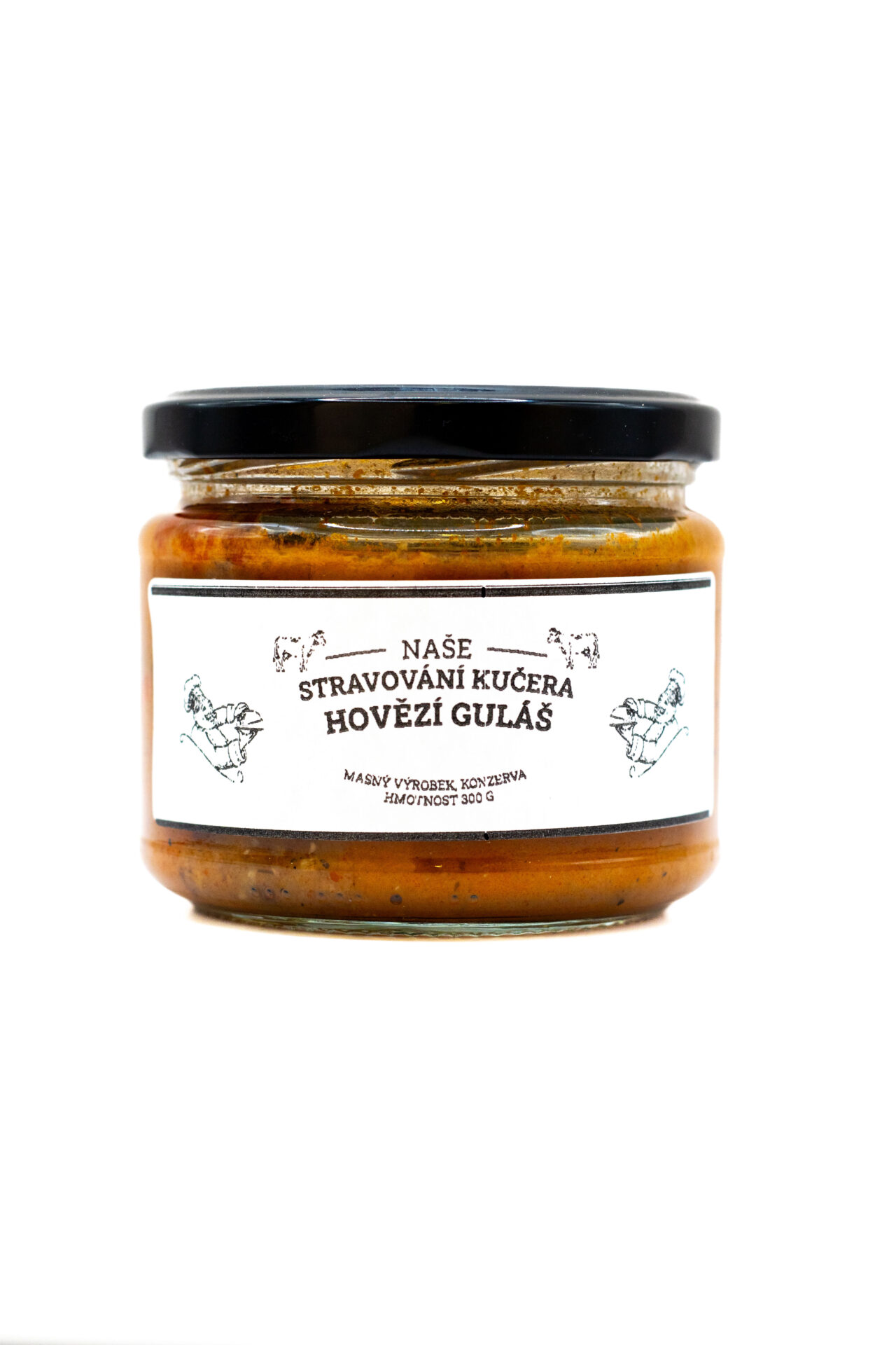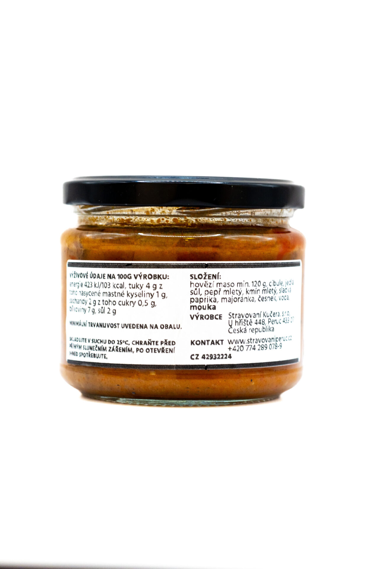 Složení: hovězí maso, sůl, pepř, cibule, paprika sladká, kmín, majoránka, česnek, voda, mouka (obsahuje lepek), hořčice, voda