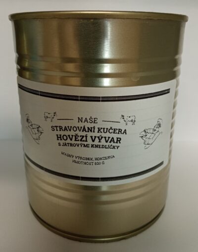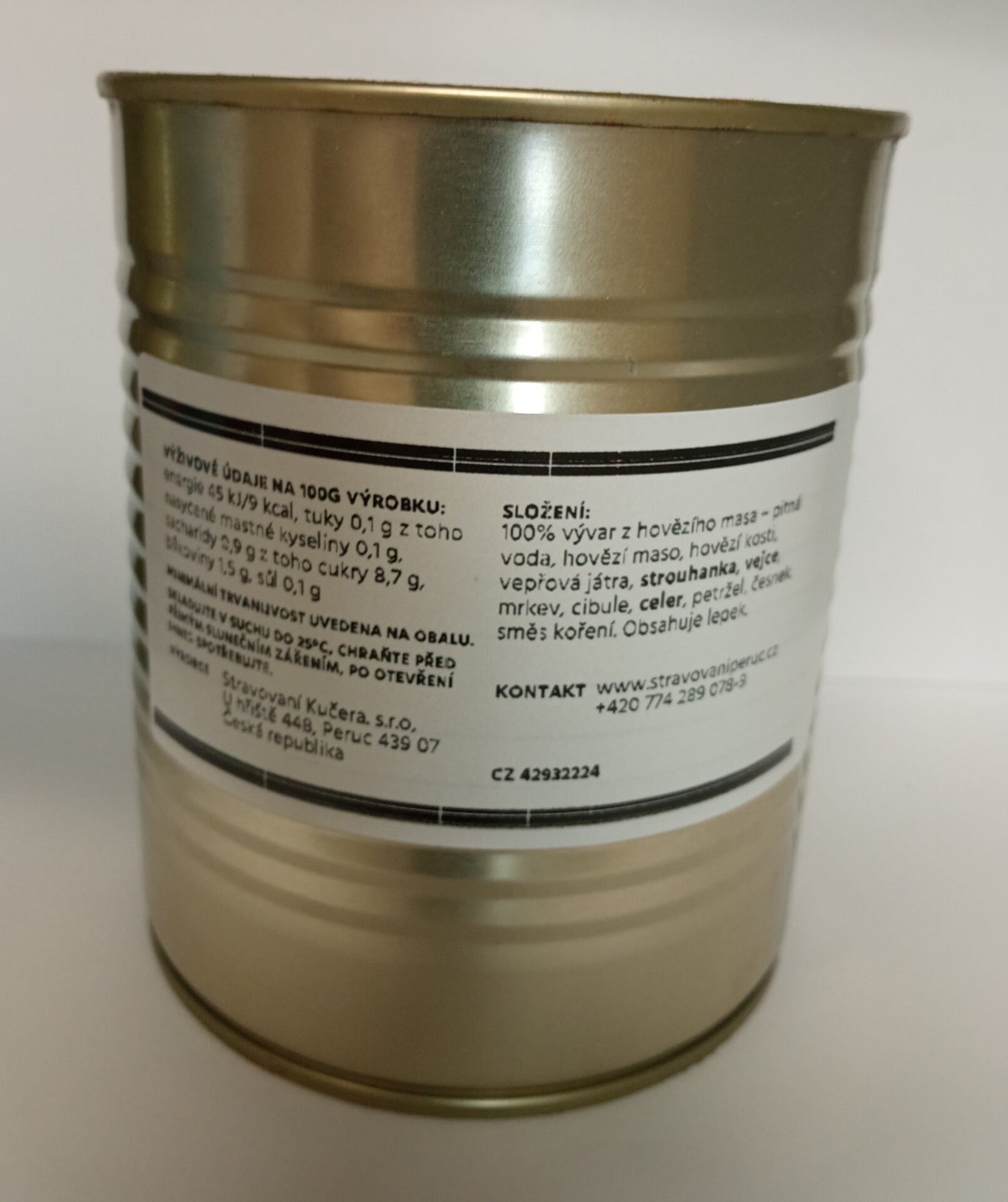 Složení – 100% hovězí vývar – pitná voda, hovězí maso, hovězí kosti, vepřová játra, strouhanka, vejce, celer, petržel, česnek, směs koření. Obsahuje lepek