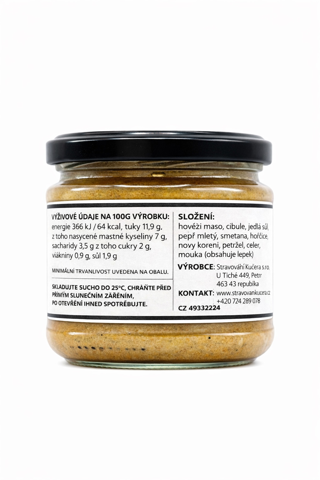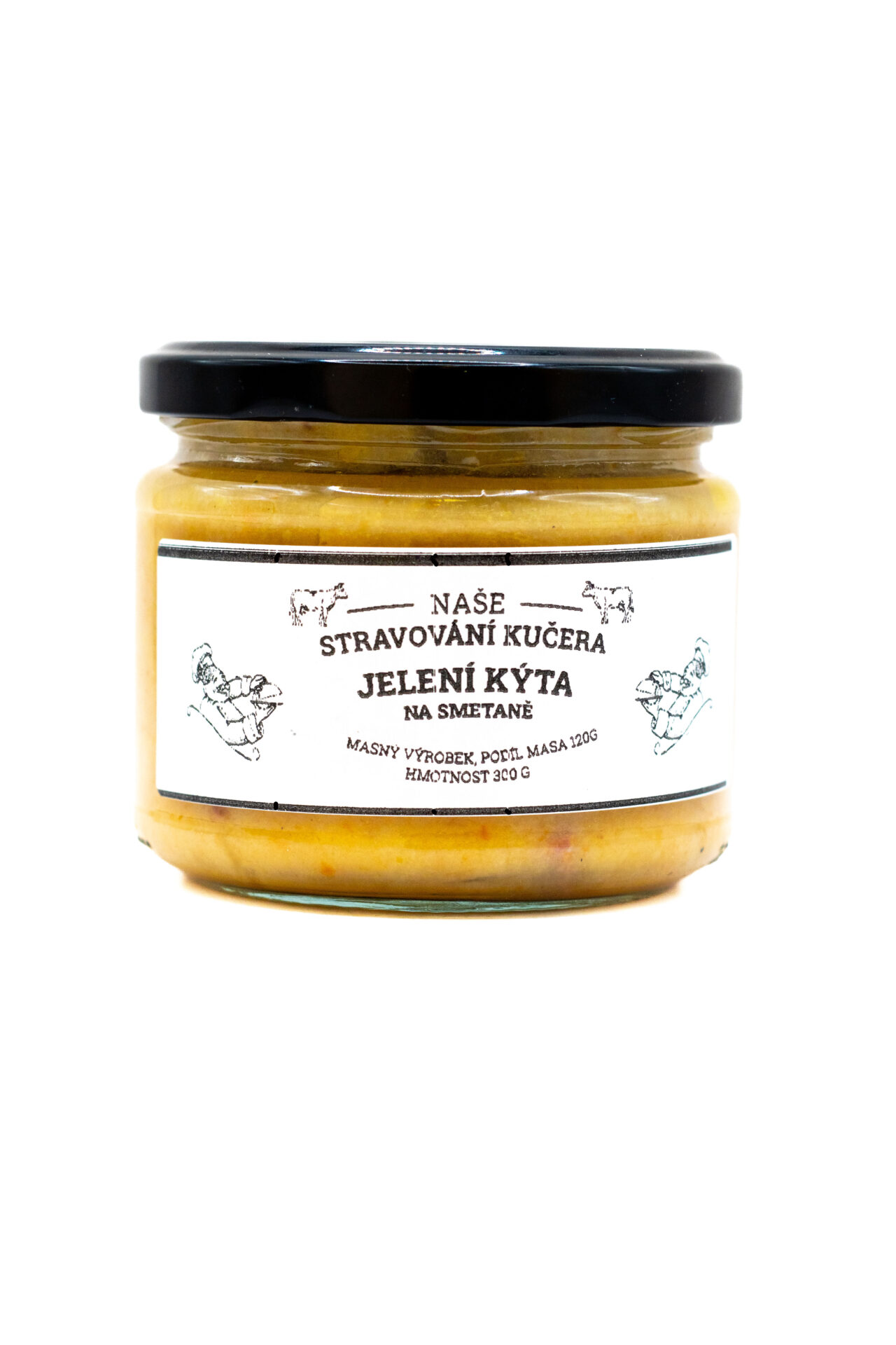 Složení: jelení maso, sůl, pepř, nové koření, cibule, mrkev, petržel, celer, ocett, voda, smetana, hořčice, mouka (obsahuje lepek)
