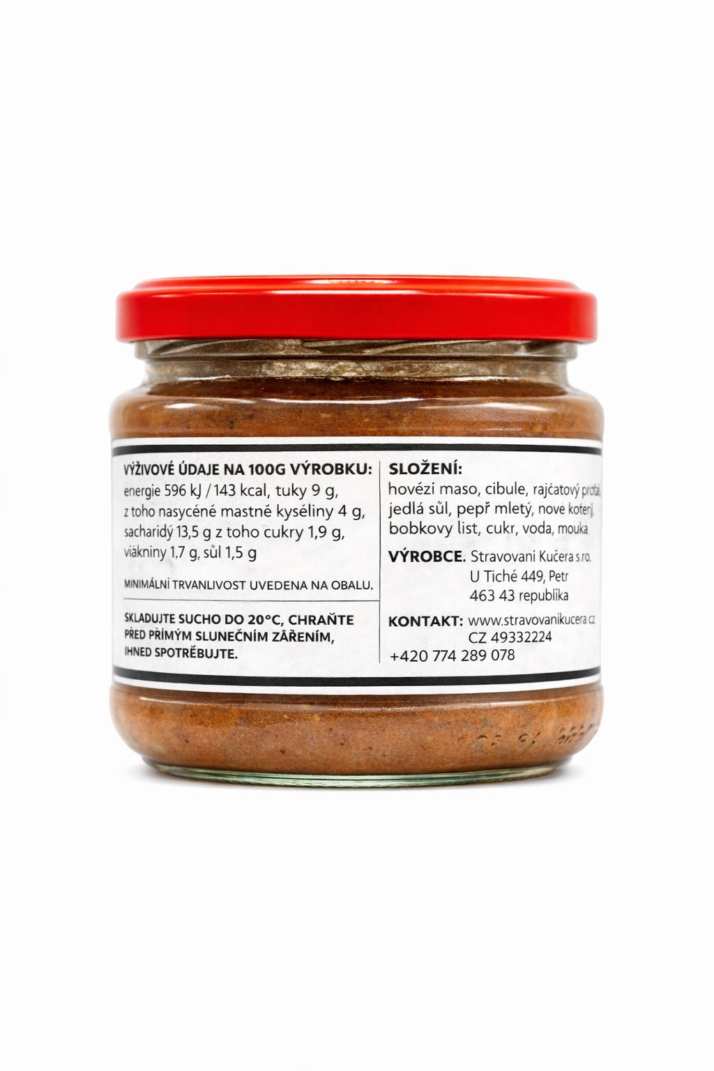 Složení: hovězí maso, sůl, pepř, nové koření, bobkový list, cukr, voda, rajčatový protlak, mouka