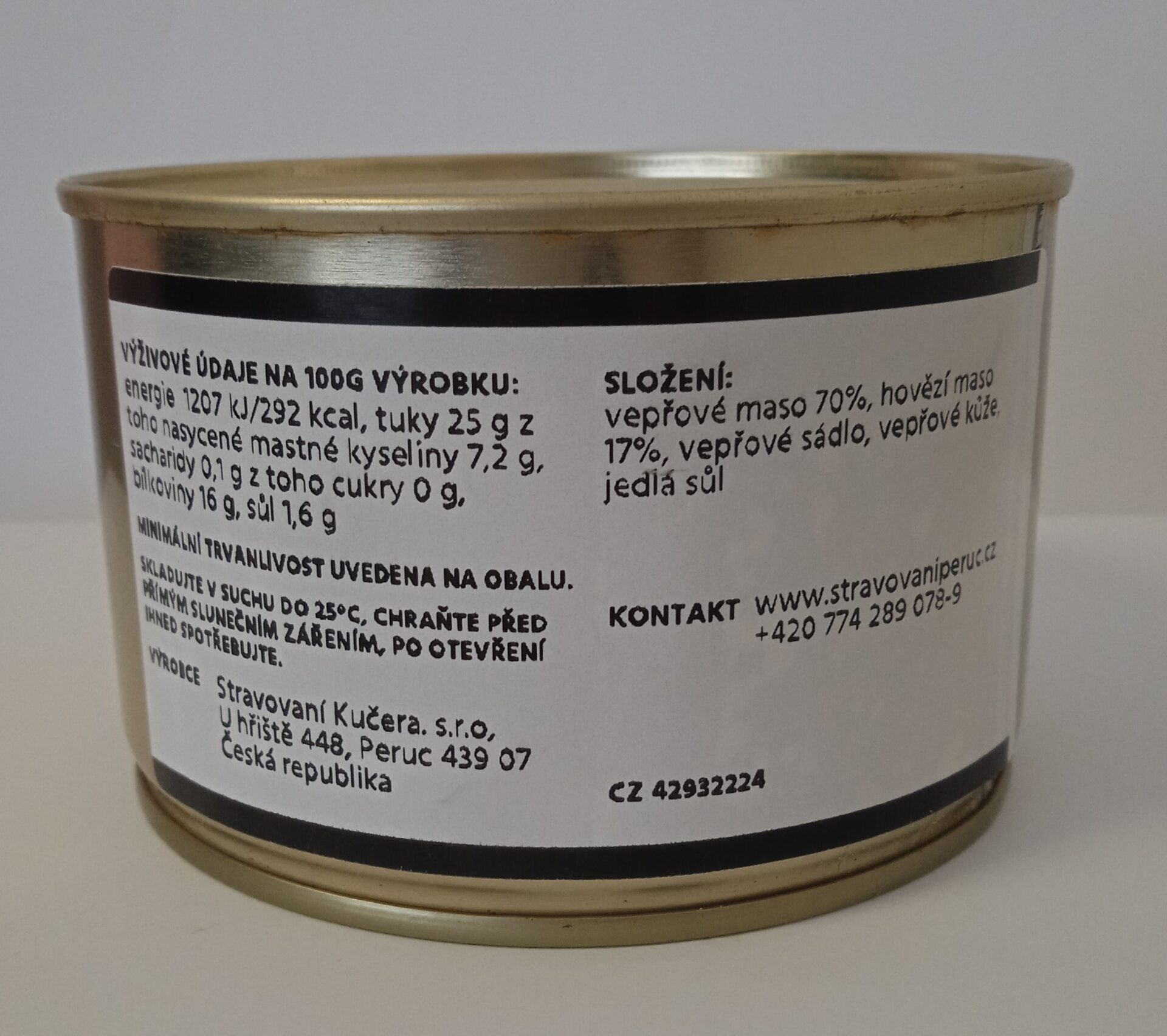 Složení – vepřové maso min. 70%, hovězí maso 17%, vepřové sádlo, vepřové kůže, jedlá sůl