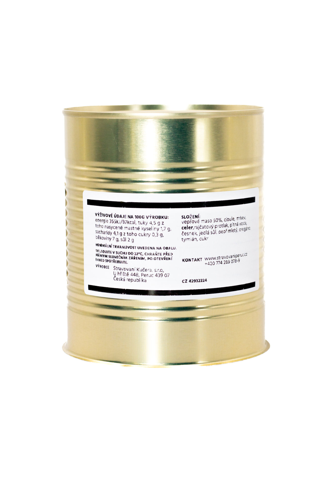 Složení – vepřové maso min.240g, mrkev, celer, protlak, pitná voda, cibule, česnek, pepř, oregáno, tymián, sůl, cukr